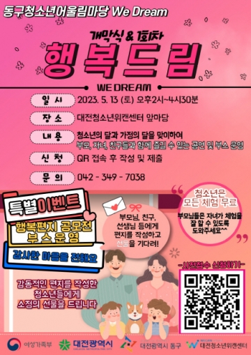 대전 동구(구청장 박희조)가 주최하고 대전 청소년위캔센터(센터장 조정현)가 주관하는 ‘2023 대전 동구 청소년어울림마당 We Dream’이 막을 올리고, ‘개막식과 1회차 행사 행복드림‘이 대전 청소년위캔센터 앞마당에서 개최된다.