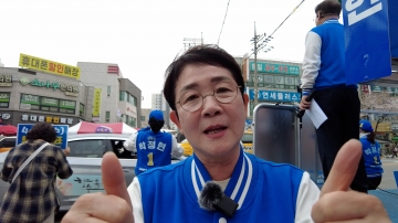 "박정현 대덕구 국회의원 후보가 신탄진 농협 맞은편 유세현장에서 4월 10일 투표하면 민생이 살고 민주주의도 살린다"며 소중한 한표를 행사해달라고 했다.
