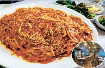 이 집의 대구뽈찜 요리는 쫄깃한 대구 위에 아삭한 콩나물을 올리고, 그 위에 빨간 양념을 올려 마무리하는 조리법인데, 겉으로는 메인 식재료인 대구가 전혀 보이지 않는다.