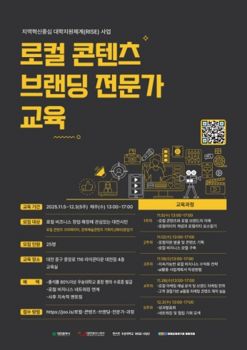우송대학교 RISE사업단(단장 정병현)이 대전광역시, 대전테크노파크와 협력해 로컬 비즈니스 창업 역량 강화를 위한 ‘로컬 콘텐츠 브랜딩 전문가 교육’ 과정을 오는 11월 5일부터 운영한다.