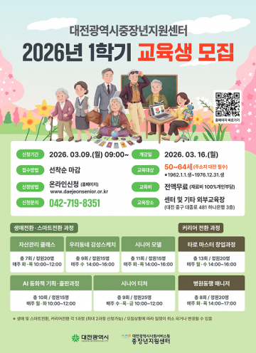 대전중장년지원센터는 ‘2026년 1학기 교육생 모집’을 진행하고 중장년층의 생애전환과 역량 강화를 위한 다양한 교육 과정을 운영한다고 밝혔다.