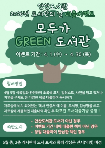 안산도서관, ‘도서관의 날’ 맞아 4월 한 달간 GREEN 대출 이벤트 개최