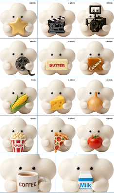 색감은 팝콘을 연상시키는 크리미한 아이보리 톤을 기본으로 하여 부드러운 분위기를 구현했으며, 상황과 콘셉트에 따라 캐릭터가 지닌 색감과 오브제가 다양하게 변화할 수 있도록 설계됐다. 또한 머리와 몸의 경계가 자연스럽게 이어지는 일체형 구조와 짧고 간결한 팔다리 표현으로 전체적인 통일성과 완성도를 높였다.
