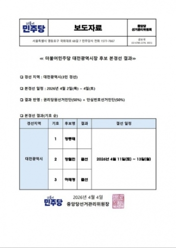 4일 민주당 중앙당선거관리위원회가 발표한 보도자료에 따르면, 이번 경선은 대전광역시를 대상으로 3인 경쟁 구도로 진행됐다.